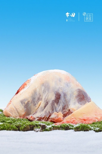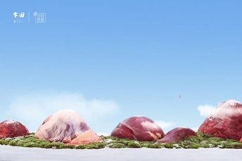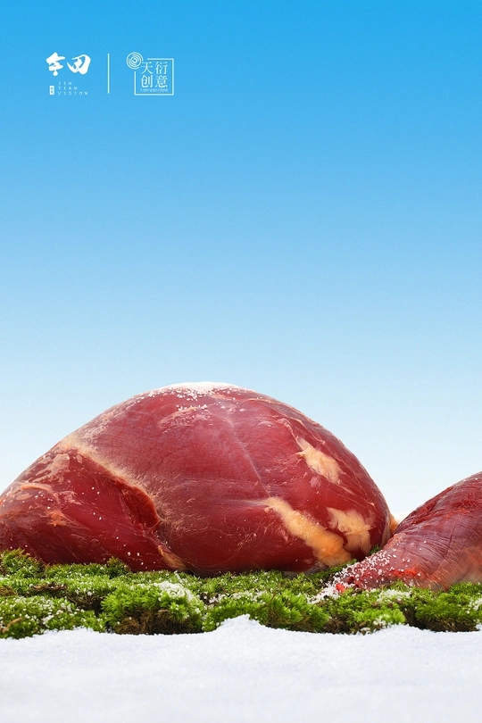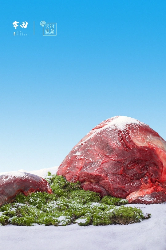 为某牦牛肉生产加工企业拍摄的一张宣传片。用大块的牦牛肉做成山的造型,顶部的雪是用的细盐。草原是用的苔藓。通过这样的场景设计,把牛肉和雪域高原产生了联系,也和普通的牛肉拉开了差距。画面具有了品牌识别度和记忆度。