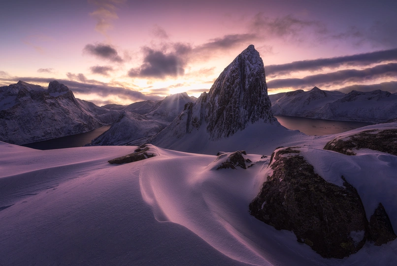 在挪威极北,每年的冬季太阳都会在南方的地平线上升起,几个小时后又落下。在这种低角度的光线下,如果云量合适,天空会有很长一段时间呈现出浓烈的像薰衣草一般醉人的紫色,浸染着整个世界!