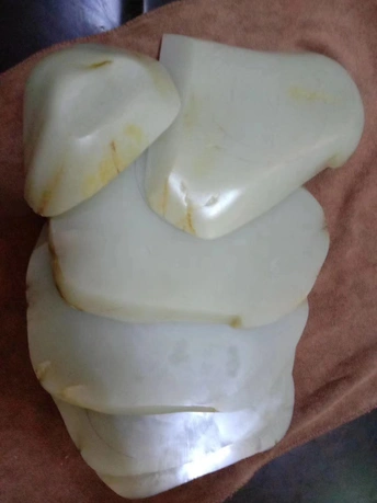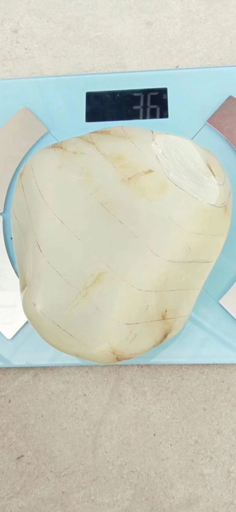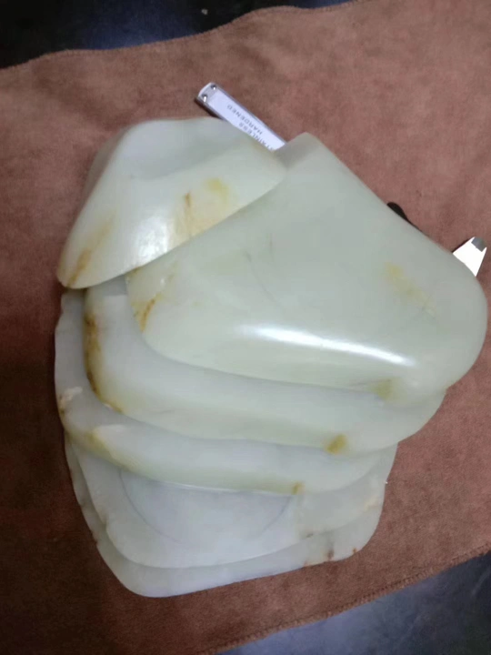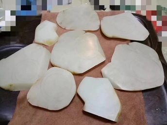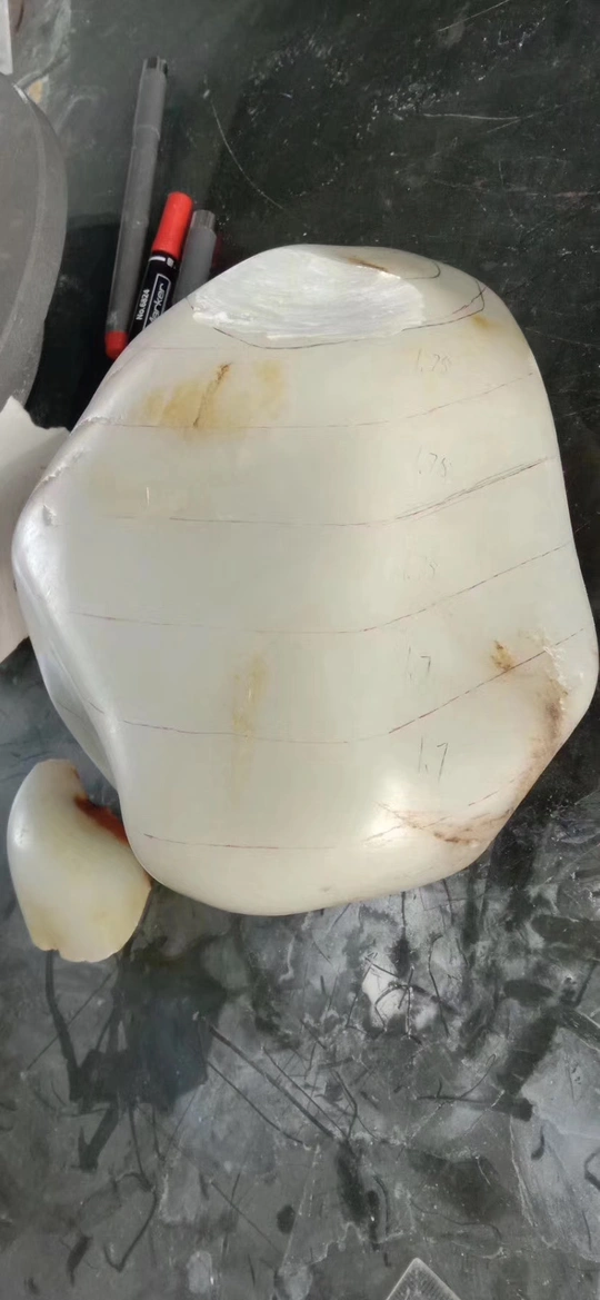 新切出一块白度很好的原石 几乎刀刀惊魂 没有太大的毛病 切片之间有点色差不过相对于 穿糖,火龙果来说完全可以忽略! 能出好多精品手镯