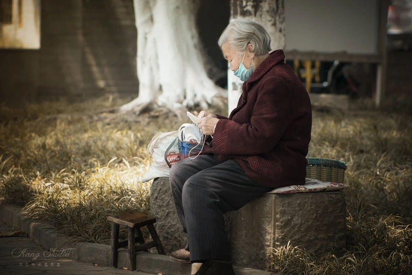 那日,阳光正好,溜达去公园,途中看见这位老人纳鞋底戴着口罩在纳鞋底。