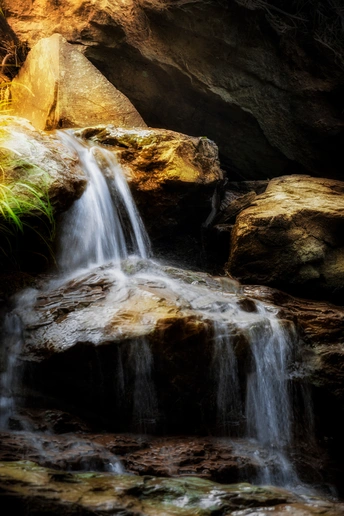 这个图是我拍摄于大山中的一条大水沟中。当时太阳位于河流的上游方向,光线不是很明显……后来通过曝光合成优化了一下光影的效果。