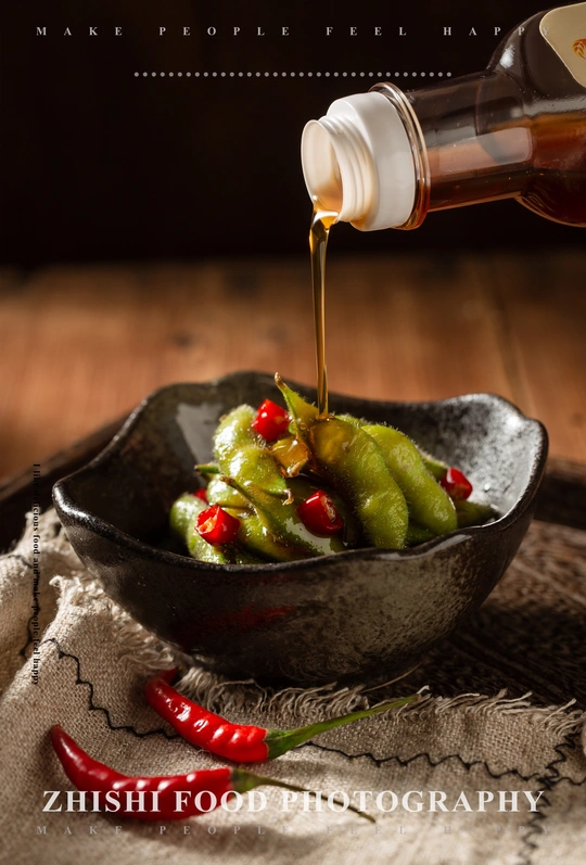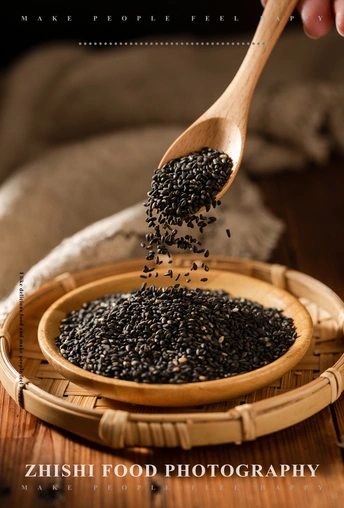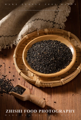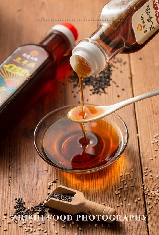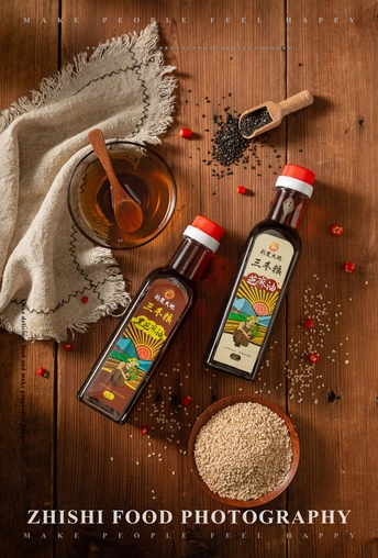 色如琥珀 橙黄微红 浓香醇厚 经久不散 这是芝麻油带给我们的感受 具有1600年历史的油 值得我们用心对待 深色的木板打造经典 同色布艺渲染出生活的味道 再加点芝麻和蔬菜的点缀 一副存在于你身边的美 就在你眼前呈现