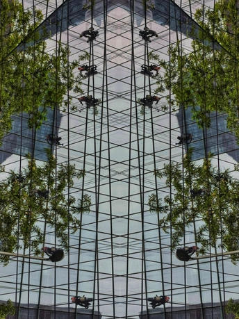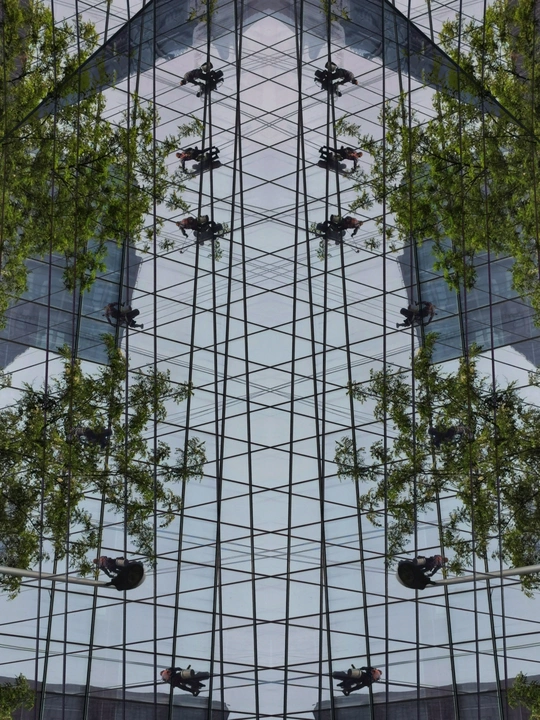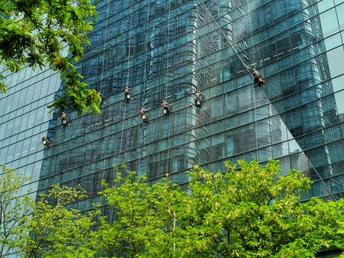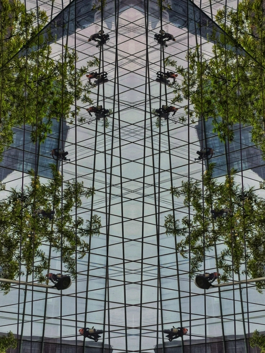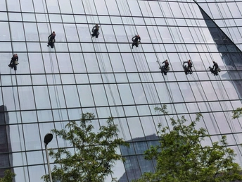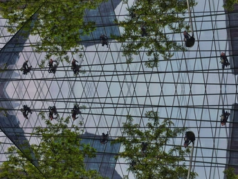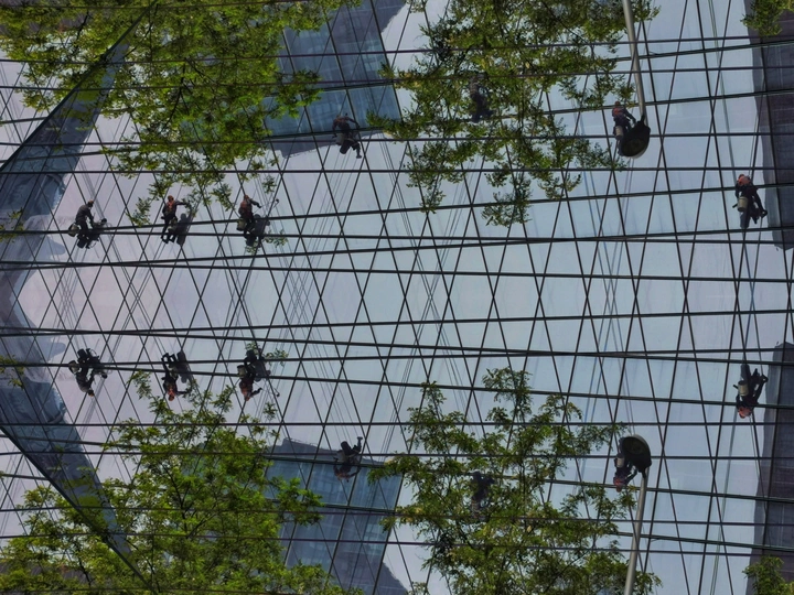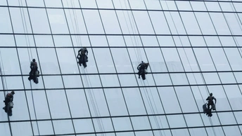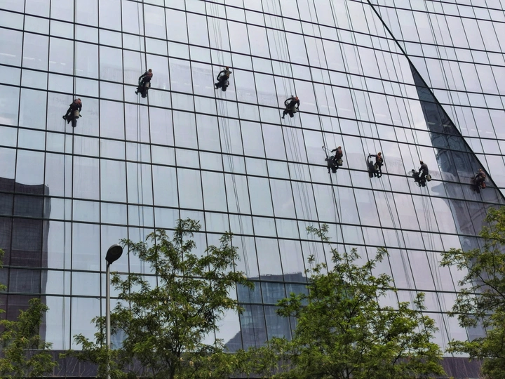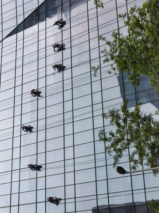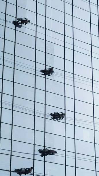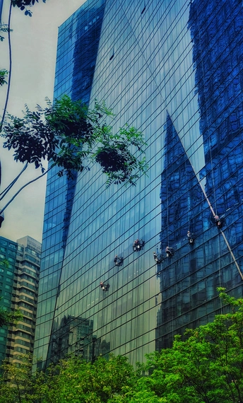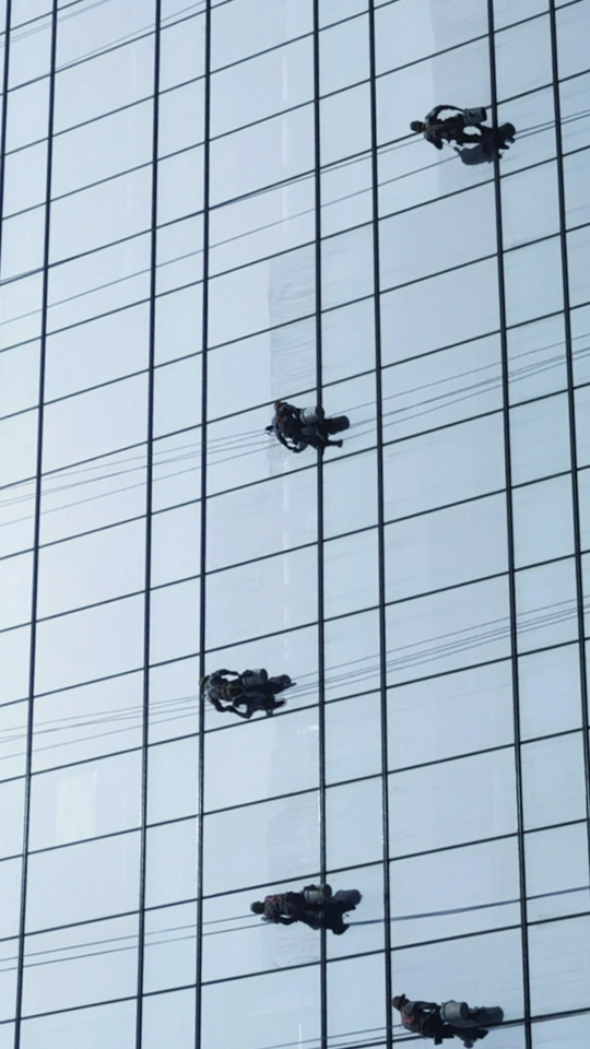 街头看见一栋高楼做外墙清洁,在光影交错的玻璃外墙上工人们像蜘蛛一样漂移着,看着都恐高?
