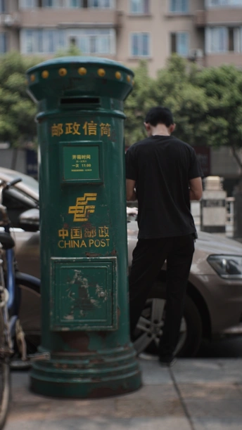 邮筒和靠着它玩手机的小伙,快与慢,时代进步。