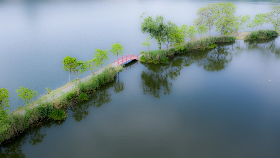 航拍南京中山植物园内湖堤。