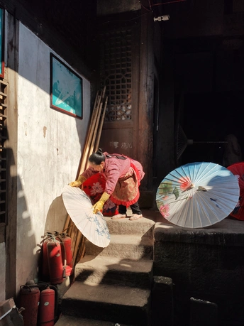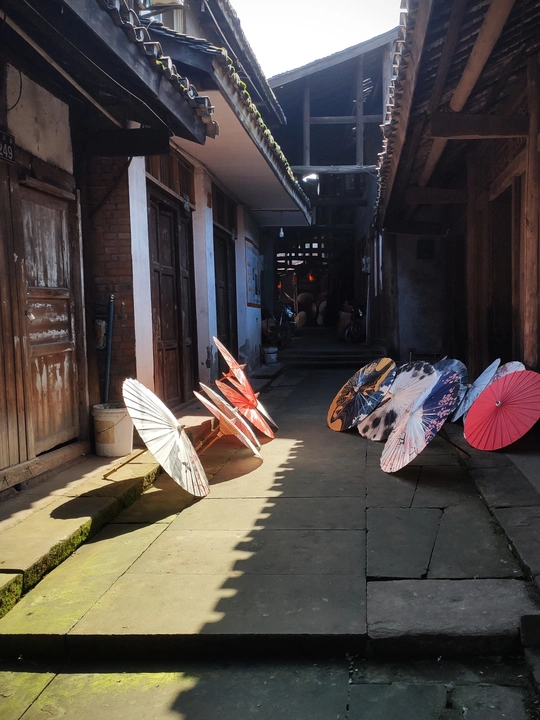 油纸伞在以前是遮雨的工具,却是在晴天里做出来的其乐无穷。