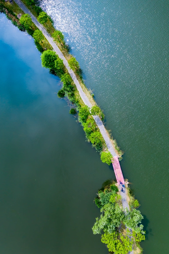 阳光照射下的南京前湖湖水显出蓝绿的自然色彩。