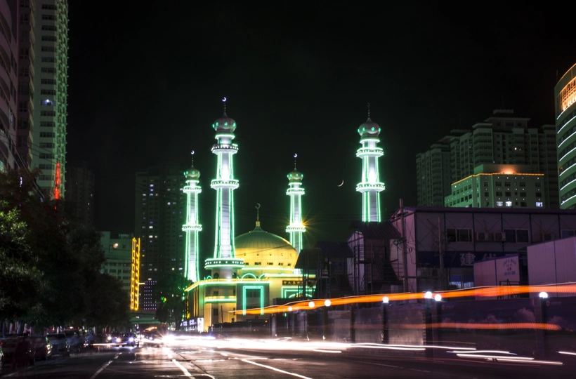 拍摄于甘肃兰州西关清真大寺,天边远处的月亮与清真寺拱顶的月亮刚刚好。