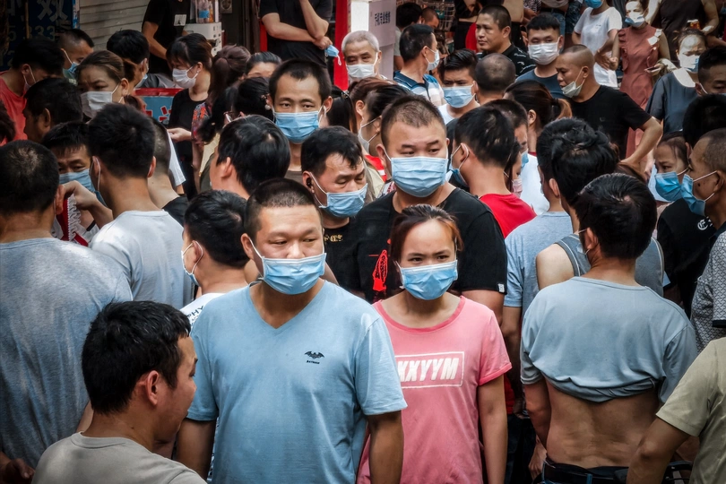 为了生活的继续 失业的人们戴着口罩 挤在人堆寻找工作
