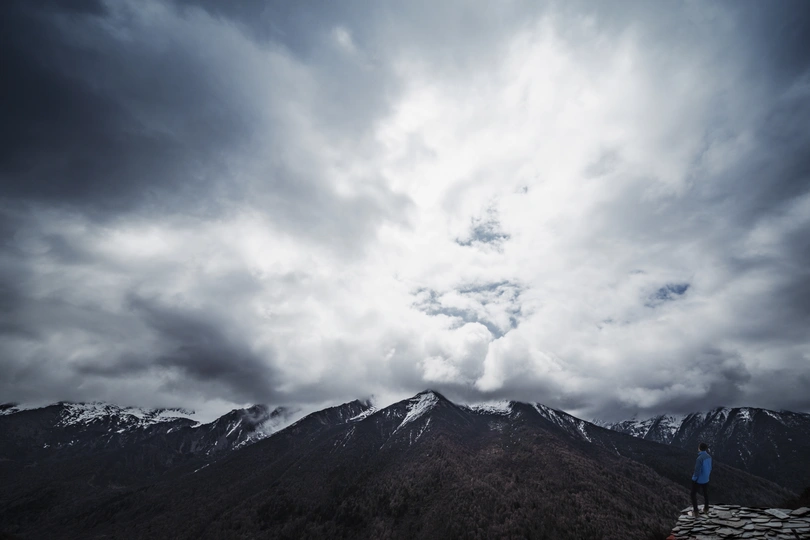 四姑娘山外摄旅途上的一处石级上,遥望远处的无名雪峰同时,作为此趟征服之旅的印证。