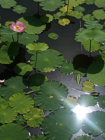 明晃晃的日光映照在荷塘,像一面镜子,闪动着逼人的光芒。。。