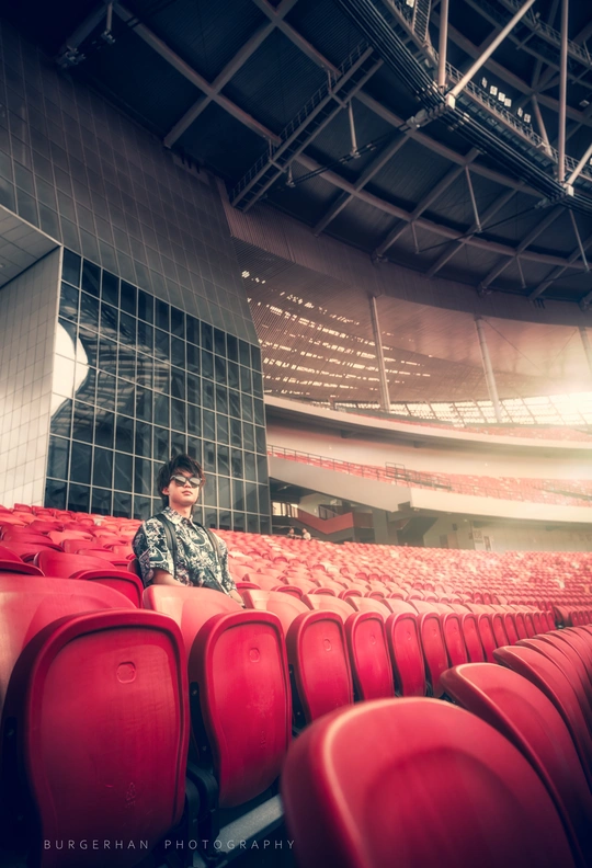 日落的夕阳照入体育场内,阳光洒落在观众席上,整个场馆被静谧的祥和所笼罩