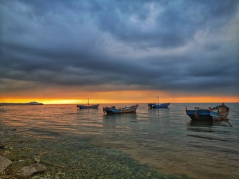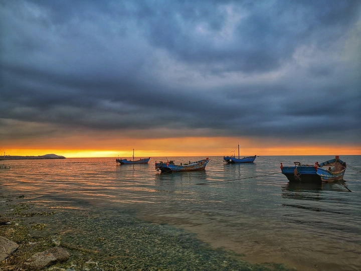 夕阳西下,渔船泊港,徐徐微风,海天交融,令人向往。