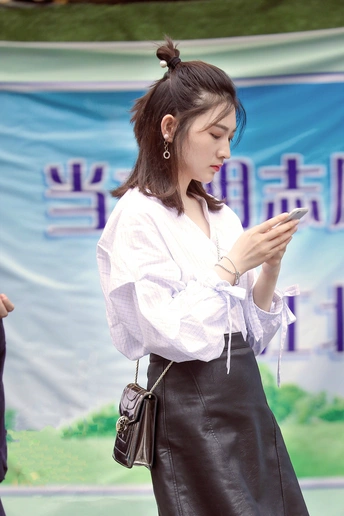 小姐姐小皮裙配衬衫,精神头足