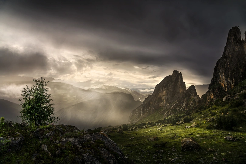 孜珠山,海拔4800米左右,是雍仲本教历史上著名的神山圣地之一。下山途中,忽见远处天上涌起来一片黑云,就像泼翻了一盆墨汁,半边天空霎时昏暗,远处的怒江峡谷若隐若现,黑云翻墨未遮山,白雨跳珠乱入眼。卷地风来忽吹散,神山树下水如天!