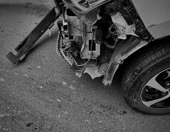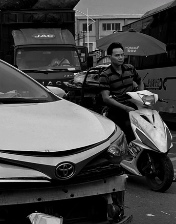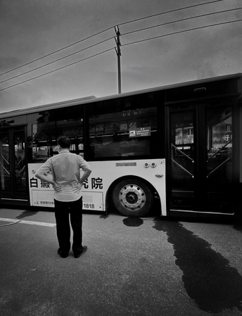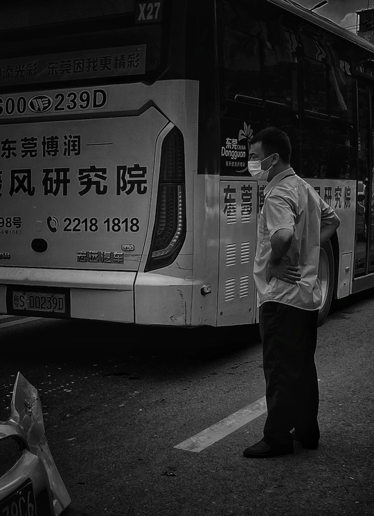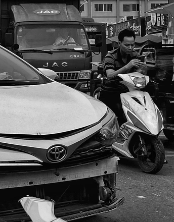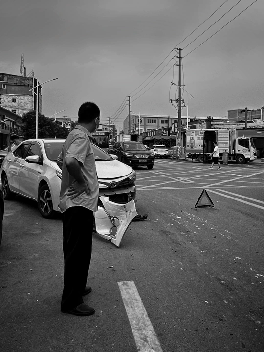 卡罗拉和大巴的剐蹭,小车损伤严重,巴士司机无奈的等待定损,交通也因为事故阻塞,后期调成黑白色