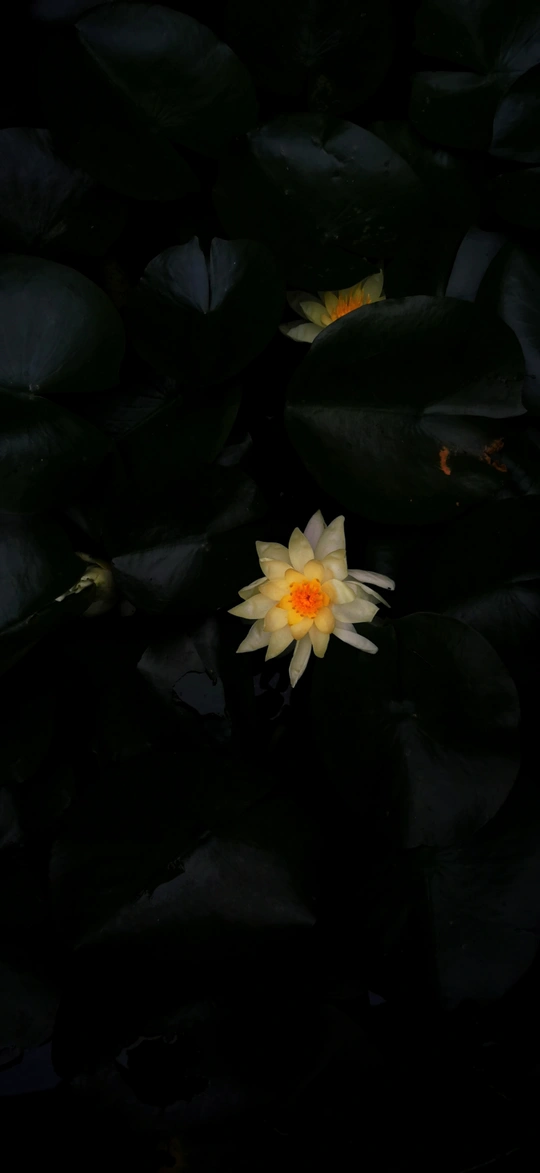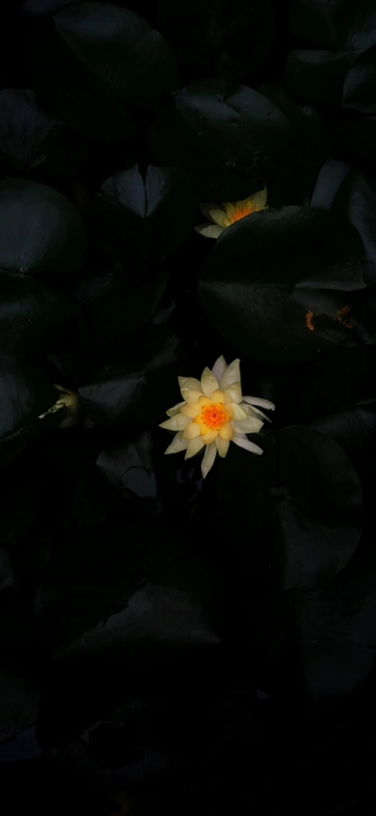 暮色下的睡莲(位于四川大邑千佛山道观内),红橙和黄色的花瓣在深绿色的背景中显得十分醒目,有着“万绿丛中一点红”的自然美感 #植物写真# #植物摄影# #水生植物# #开花植物# #植物色彩#