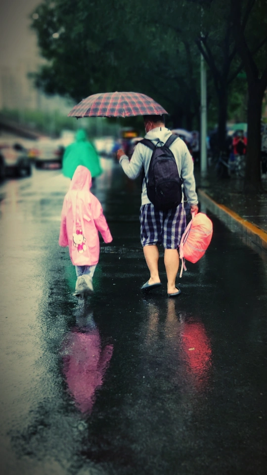 今早北京的雨 上班路上偶遇一对父女 孩子鞋上裹着塑料袋 父亲一手拿着孩子的包 还背着包 一手还打着伞 即使孩子身披雨衣 父亲依旧将伞大部分为孩子遮挡雨水 一路上来言去语 眼看公交车来了 爷儿俩猛跑地追上公交车……