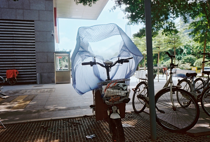 单位楼下,阵雨时来,一阵风吹起单车上罩着的雨衣,变幻出风的形状
