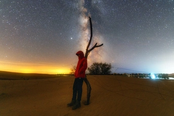 星空下孤独的思考者 与流星,银河的合影