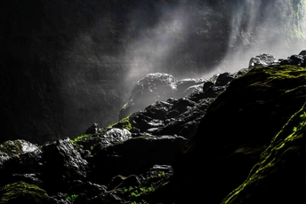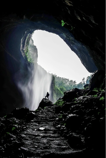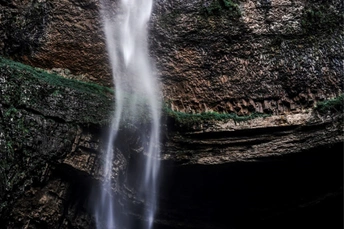 硝洞瀑布位于乐山市沙湾区,瀑布不大胜在高,约有200多米高。风光不在壮观而在秀,瀑布水随风而变,似绸似锦,似雾似烟,很有仙气。