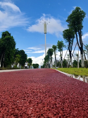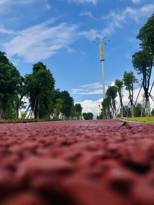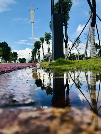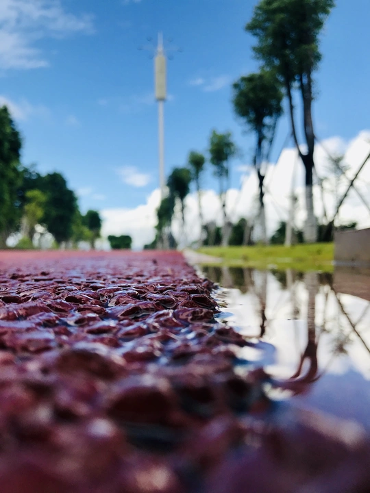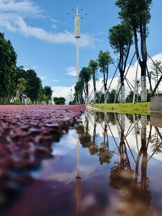 大雨过后天放晴,路洼处小有积水。 途经滨江大道,驻足观景,手机倒立拍之。