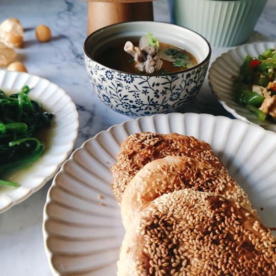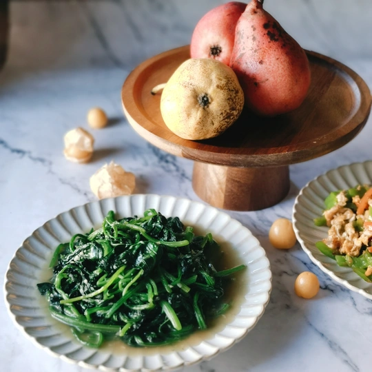 #手机摄影100天#day84 最近是几十年来前所未有的忙碌,累的不想吃饭,买的红啤梨也都要放坏了。那就简单做个酸萝卜老鸭汤,蒜蓉菠菜,辣椒炒鸡蛋,买几个香酥烧饼。咔嚓几张,打个静物卡!