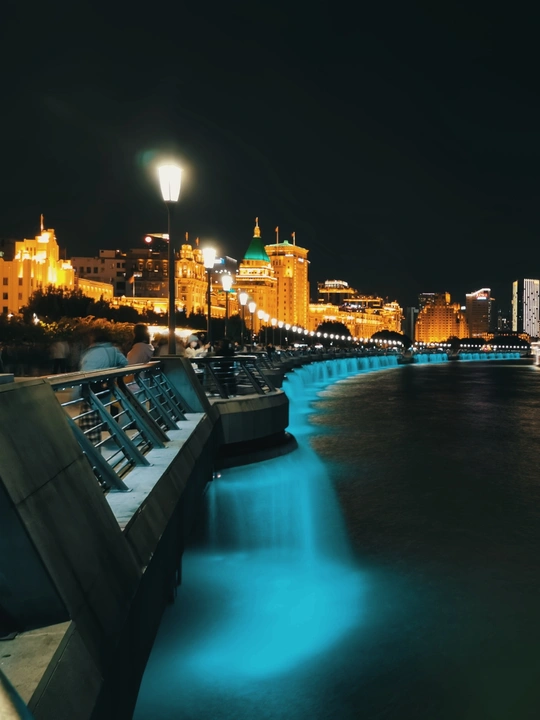 夜晚外滩边上倾泻的水流形成一张薄薄的面纱。