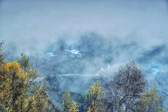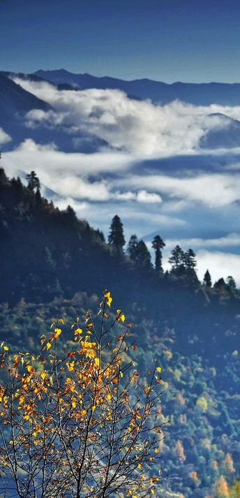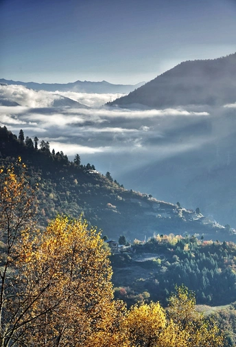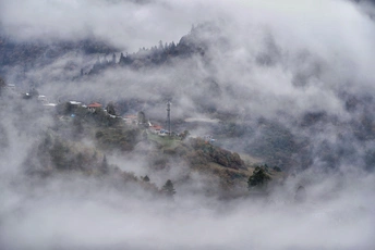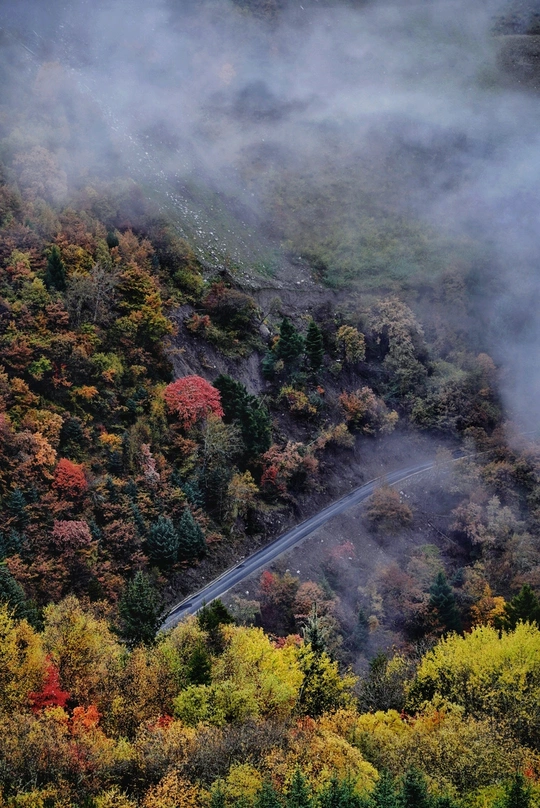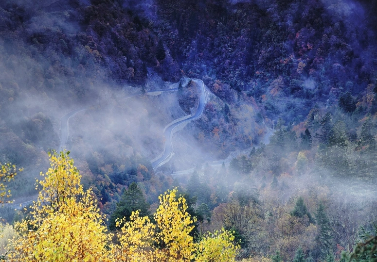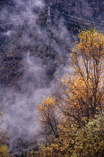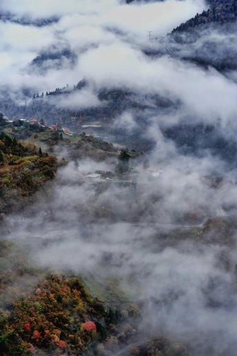 三奥雪山游客中心正好处于山谷中,早晨总会有雾从谷中升起,每天每一刻都在变化,仿佛人间仙境。
