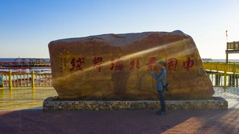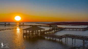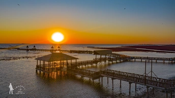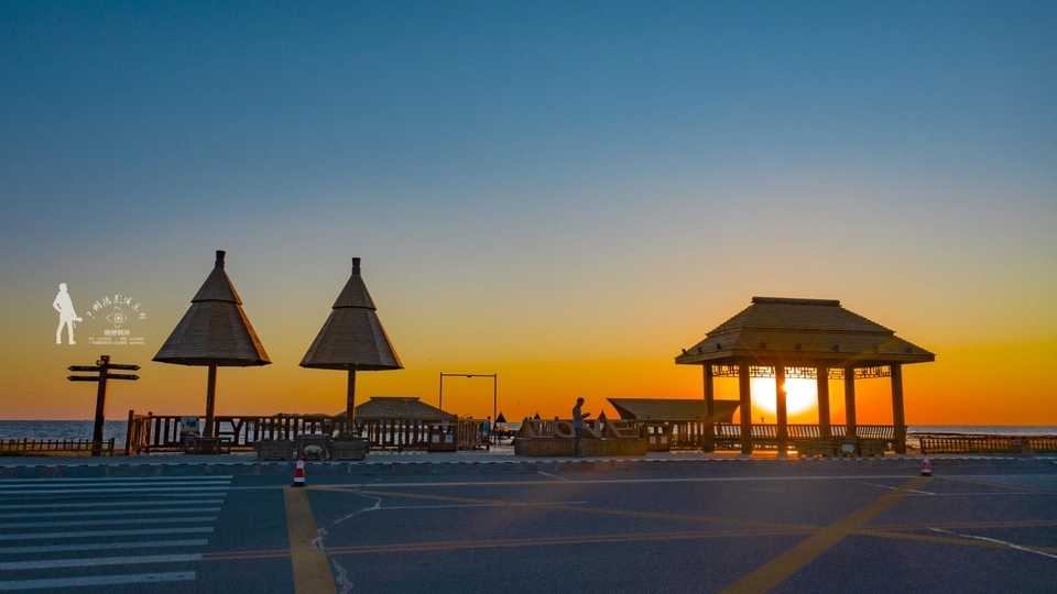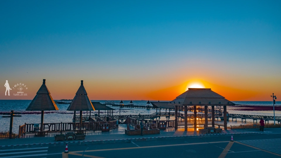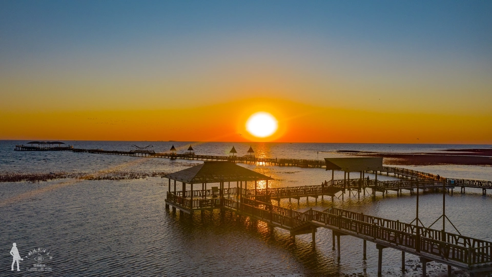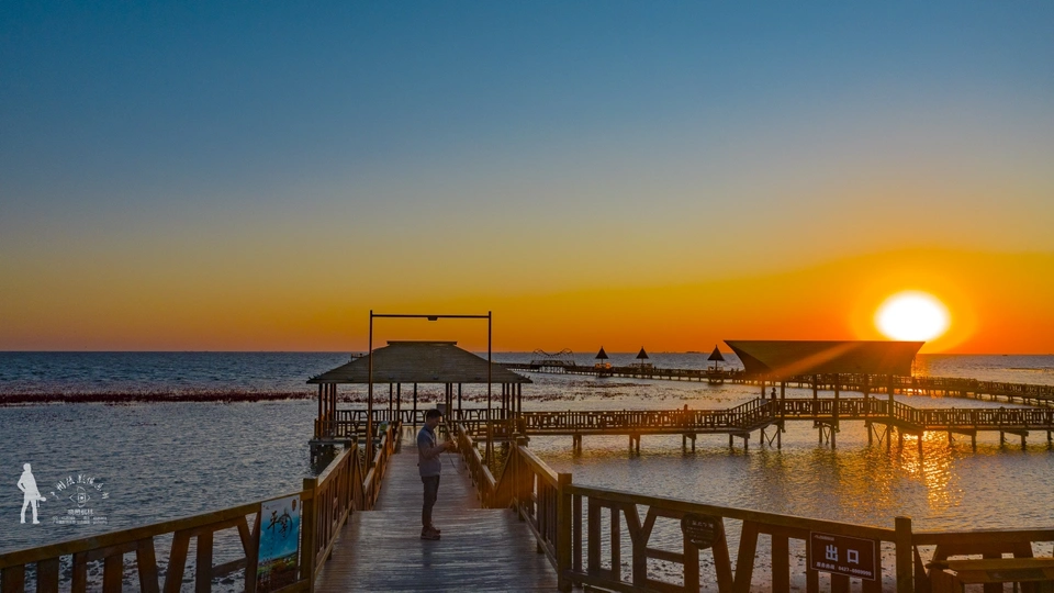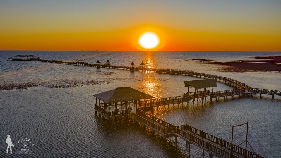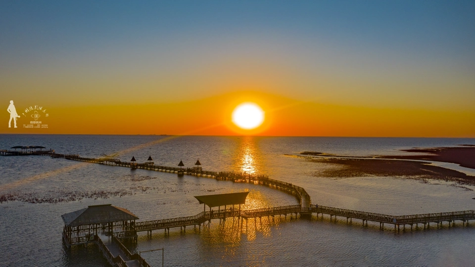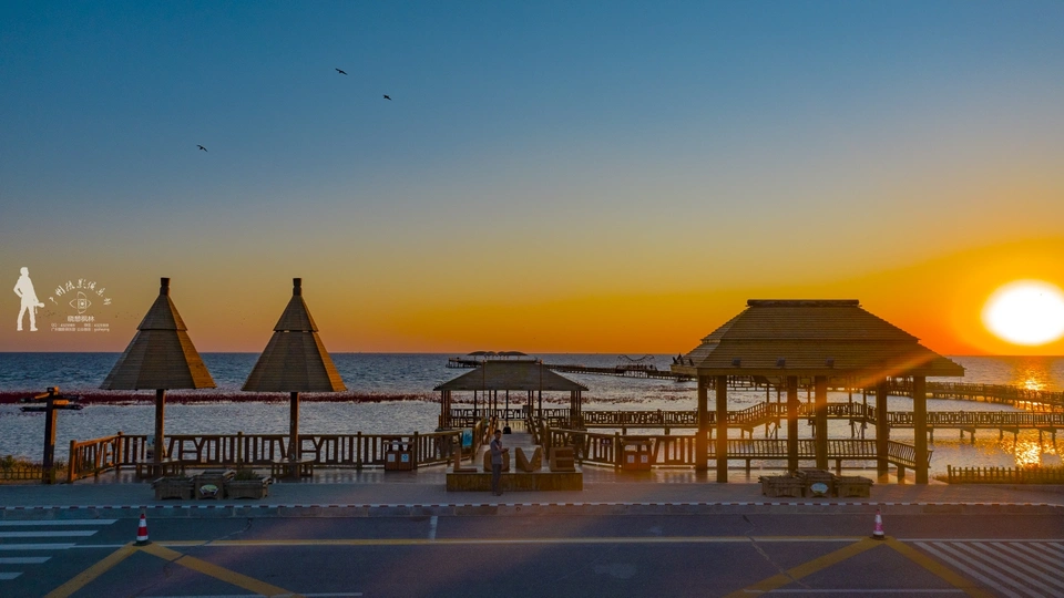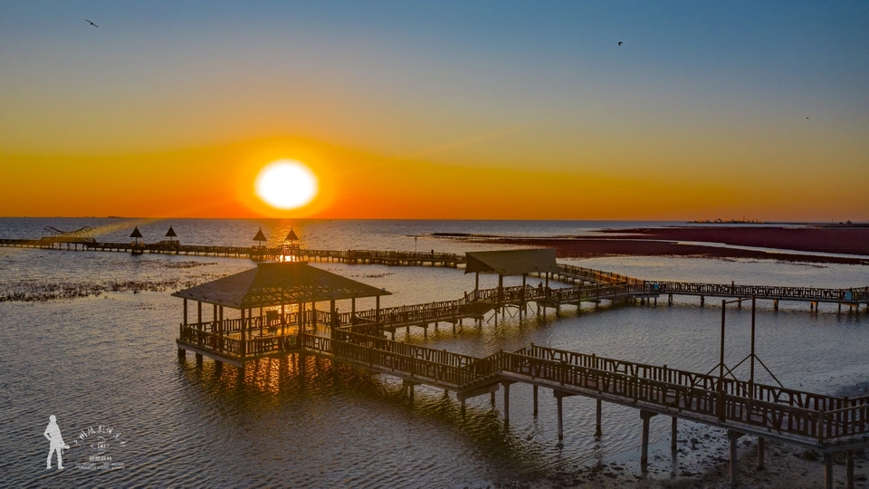 红海滩 黄昏日落风光航拍 余辉微洒,光线交错,红光粼粼,水天相接。捕捉下沉夕阳的美姿。2020年10月16日 大疆御2镜头下的辽宁盘锦红海滩国家风景廊道海边日落风景