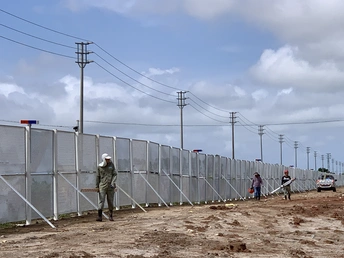江门银湖湿地公园,施工人员在烈日炎炎的夏日测量距离