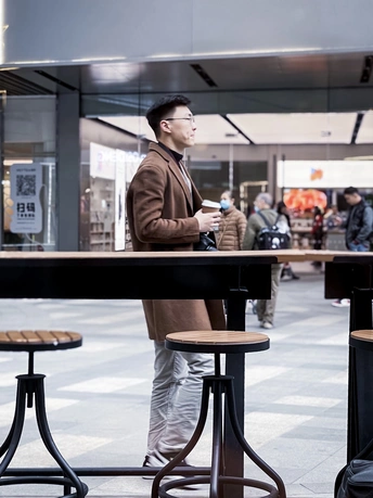 女朋友在给他拍照,摆了很久造型,都还没有拍好。