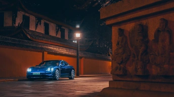睿泽深天地,宗风越古今。驾驶全新保时捷taycan纯电动跑车,穿过历经千年的香火胜地-文殊院。