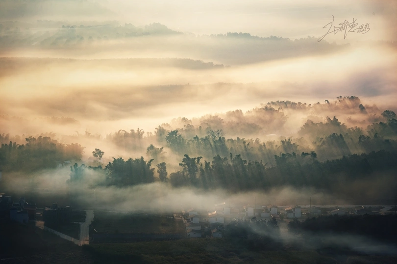 日出时刻,远山、竹林、小村,如梦如幻,这里是滇西德宏的生态乡村图景。