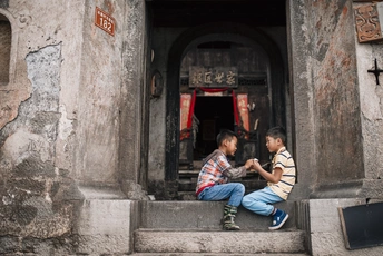 图片拍摄于贵州安顺一古镇内,一处老宅前两个小孩子做游戏