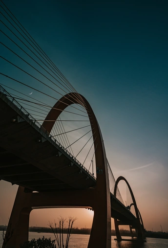 马鞍山长江大桥下,夕阳西下时,出现的日月同辉,感觉如此美好