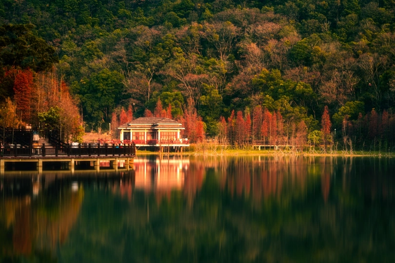 拍于江门新会石涧公园,冬日水杉渐红,在夕阳映衬下犹豫油画般漂亮