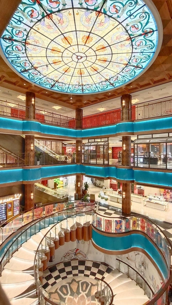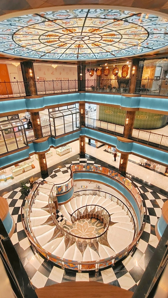 豫园(Yu Garden)位于上海市老城厢的东北部,北靠福佑路,东临安仁街,西南与上海老城庙毗邻,是江南古典园林,始建于明代嘉靖、万历年间,占地三十余亩。 但是今天我来到打卡的是魔都又添一处不来就会后悔的打卡新地标——“豫园百货”。步入豫园百货的第一刻,我就感到眼前一亮。时尚的设计、宽敞的空间、复古色彩的搭配,把整个空间装饰得富丽堂皇。尤其是那别出心裁的内装设计,运用了从上世纪30年代一直火到现在的ArtDeco风。大量直线、对称、几何图形的组合创造出极具表现力的艺术效果。 如果要把全上海最漂亮的楼梯做一个集锦,“豫园百货”必定在榜上前三位。螺旋式的花纹设计俯瞰时如同一个巨大的海螺,与黑白色的棋盘格地砖搭配,更具视觉冲击力。