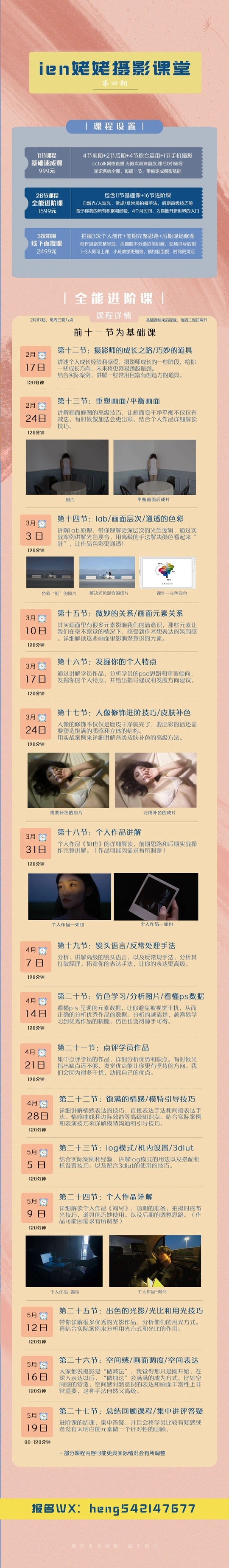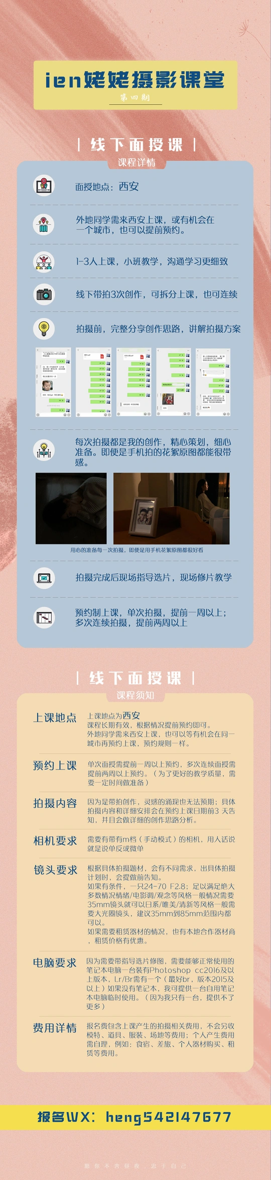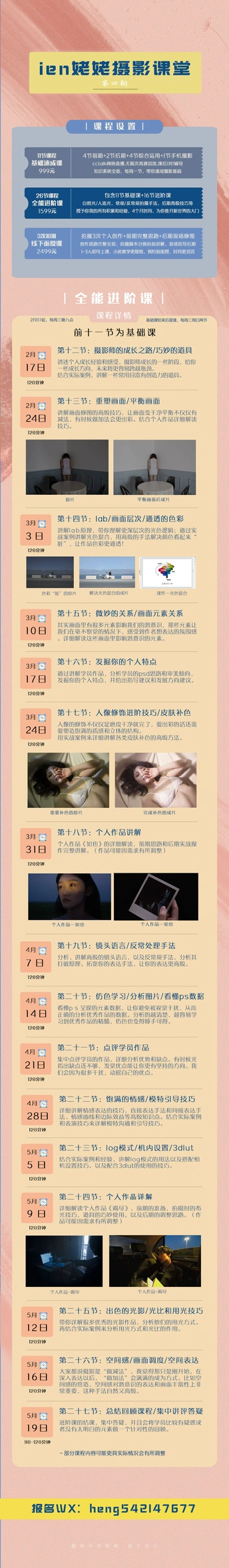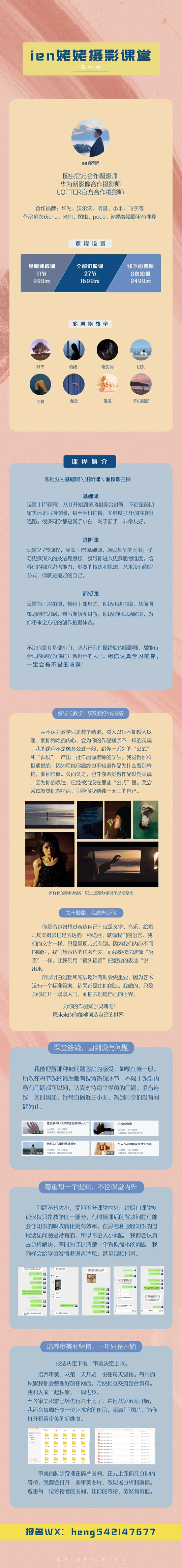 ien姥姥摄影课堂 | 第四期 基础课 | 进阶课 | 面授课 图①:课程简介 图②③④:课程详情 图⑤:常见问题 图⑥:学员福利 图⑦:学生作品 图⑧⑨:老师作品 不做千篇一律的他人,找到独一无二的自己 #ien姥姥摄影课堂#