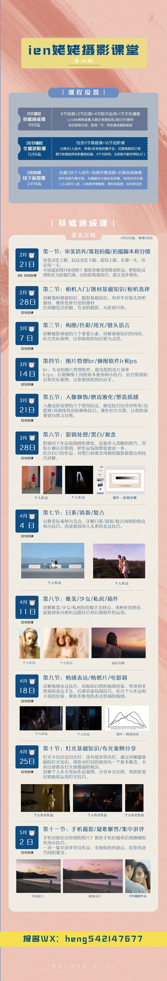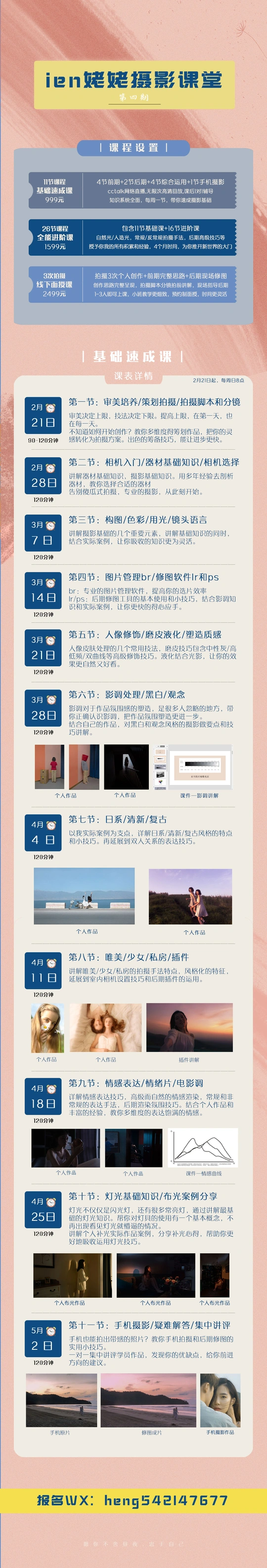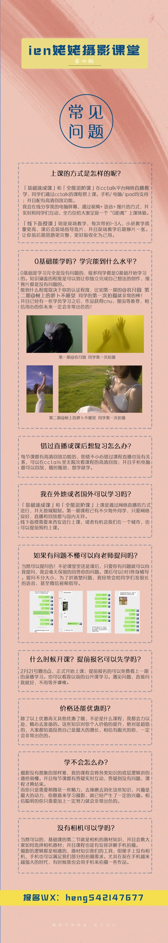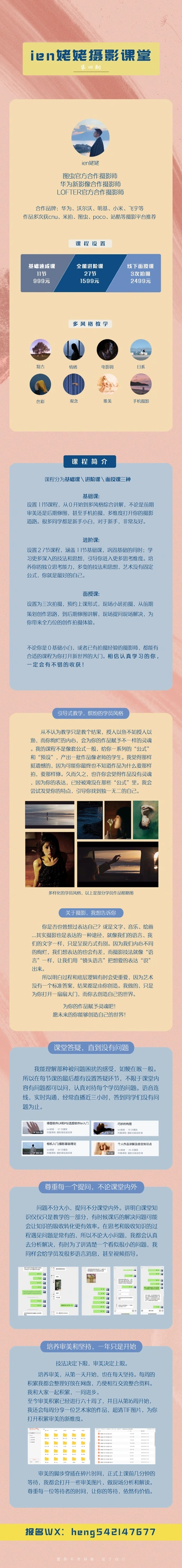 ien姥姥摄影课堂 | 第四期 基础课 | 进阶课 | 面授课 图①:课程简介 图②③④:课程详情 图⑤:常见问题 图⑥:学员福利 图⑦:学生作品 图⑧⑨:老师作品 不做千篇一律的他人,找到独一无二的自己 #ien姥姥摄影课堂#