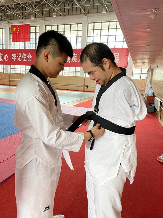 无臂运动员每次穿跆拳道服都由听力障碍的队友帮忙打结,都有障碍,但爱“无障”,心有千千结,每结都有爱!