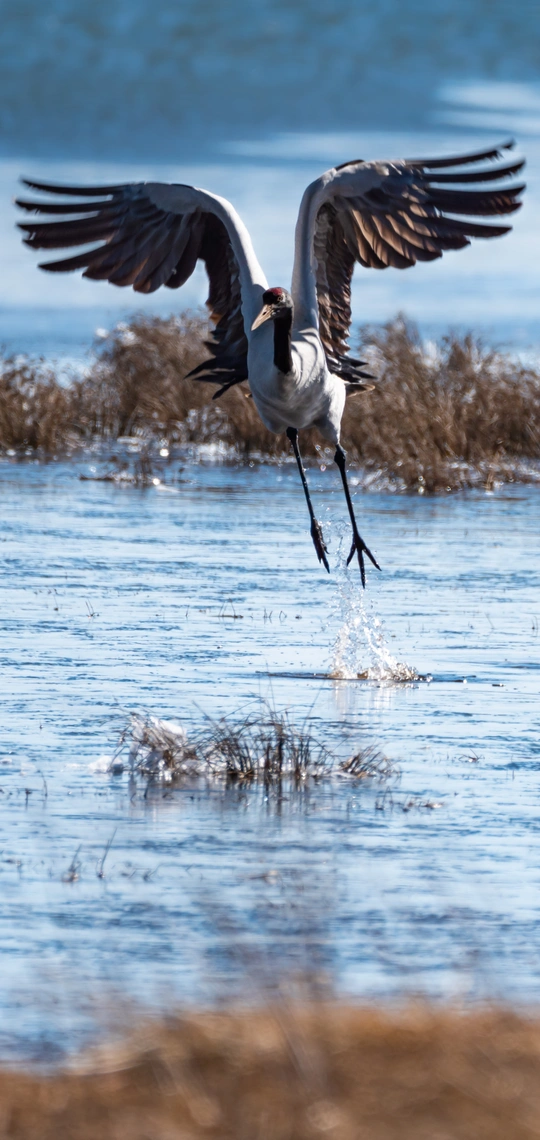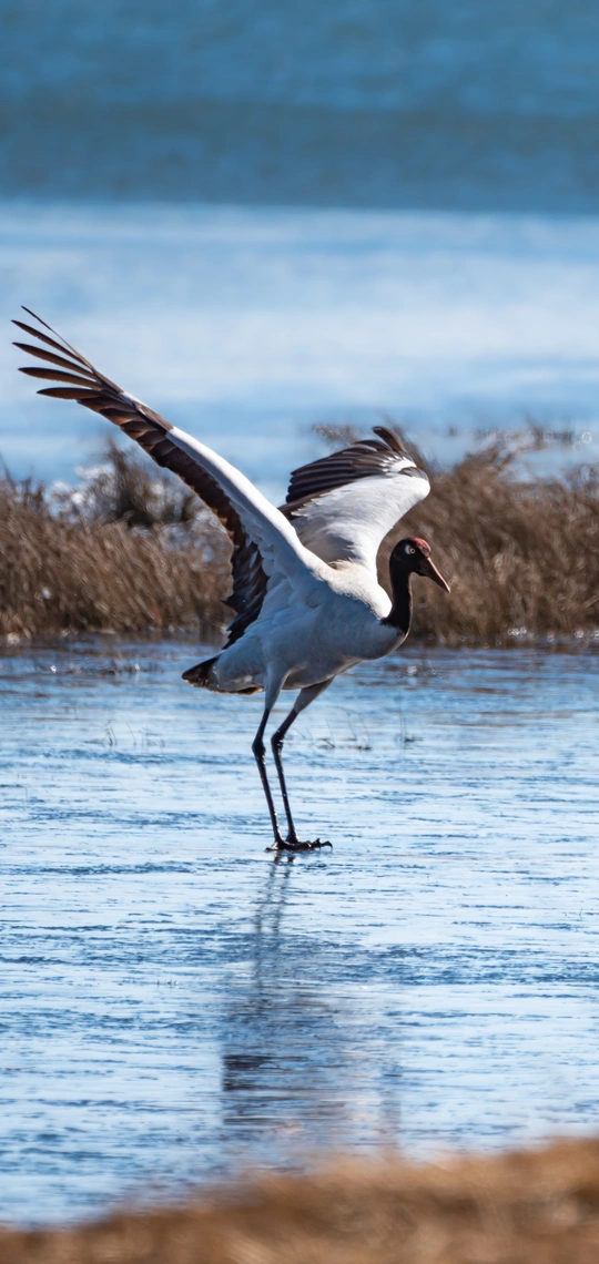 隔日,阳光终于突破云雾的封锁,融化冰雪,折射光影,一片明丽,一片绛蓝,一片金黄。安宁和谐,纯净明心,黑颈鹤美丽的身影御风而来,三级飞羽柔韧舒展,飞翼遒劲伸展如天使之翼让人慰藉,惊叹。近距离的接近他们,在他们齐鸣声里,心里像是有一脉暖流瞬间扩散至全身,仿佛已经化作一只鹤想要展翅腾空,翱翔空际。