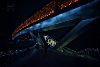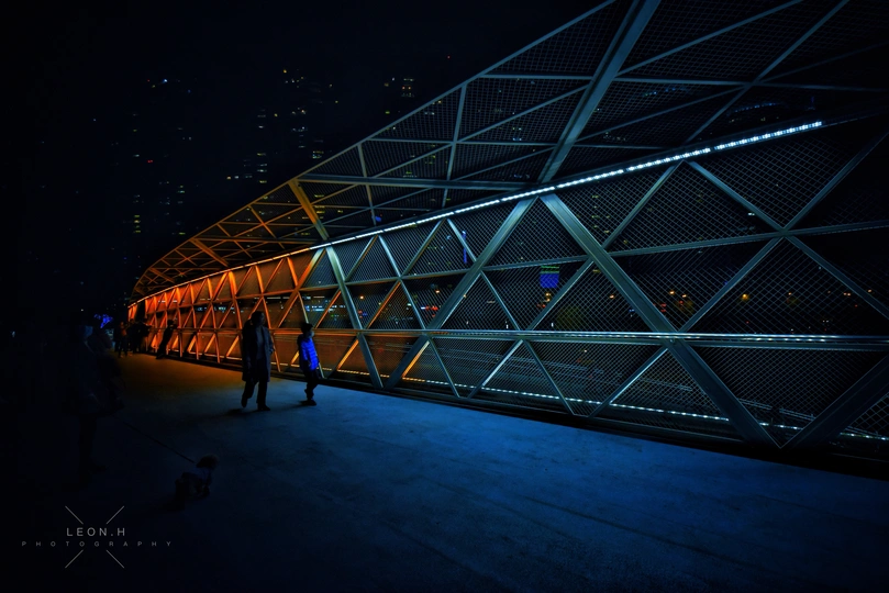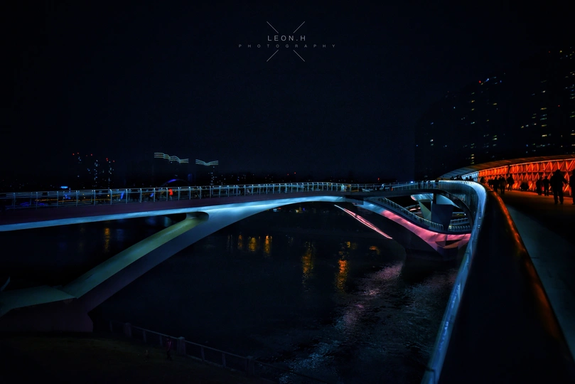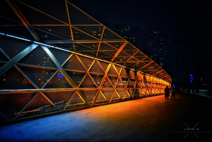 第一次去网红桥时还没通路,这次春节就地过年,趁此机会再走一波,人不像当初那么火爆(可能是被双子塔抢人气了),而今的大桥色彩更适合赛博朋克风,饱和的渐变互补色在夜里更加靓丽多姿