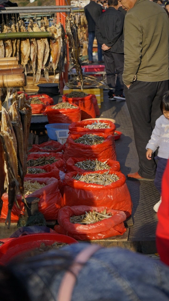 浮桥上有很多卖鱼的人,所以不法各式各样的鱼,大大小小的水盆装着大大小小的鱼,其实这些鱼只要奋力一跳,跳出水盘跃进赣江就能逃生,可是他们还是安于现状,晒着温暖的春阳……