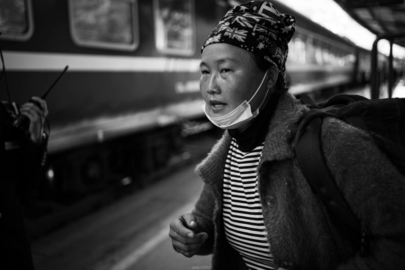 成昆线,甘洛站,T8866次列车停靠站台上,一位彝族妇女向站台工作人员询问车厢号准备上车。