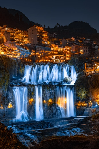 飞流直下三千尺,湖南芙蓉镇,一个挂在瀑布上的古镇,夜景格外璀璨。长曝光让瀑布拉丝,让暗部出现细节。前提要控制好高光。一个只能在动漫里出现的场景,居然现实中也有。