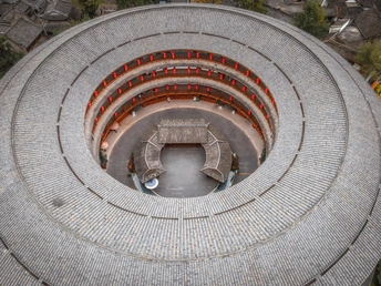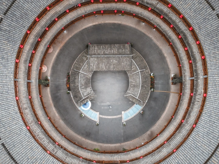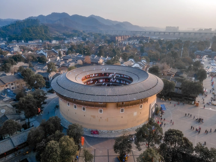 成都龙泉洛带博客小镇-博客楼是仿照福建客家土楼的风格建造,一共四层,第一层纪念品商店和茶楼。第二层西部客家博物馆,特别设立了传承推广客家文化。第三层客家“家风馆”。第四层是一些空置房间。