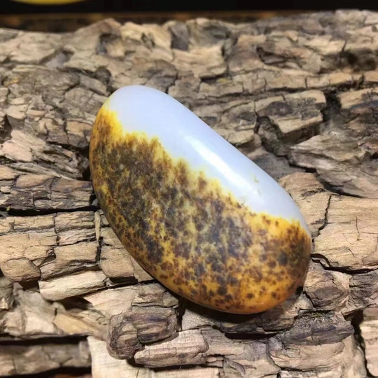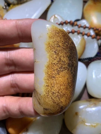有新朋友问我什么是虎皮,正好有两款标本给大家科普一下,虎皮在籽料中属于比较特殊的一种皮色,它的特点犹如其名,与老虎皮的纹路相似,因此称为虎皮,虎皮的颜色多为黄色,纹路为黑色,这种皮色的料子很有特色一看看去就能够感受到它的霸气,市场上也比较少见,属于皮色中的精品,即便雕刻也比较容易出工,你明白了吗?