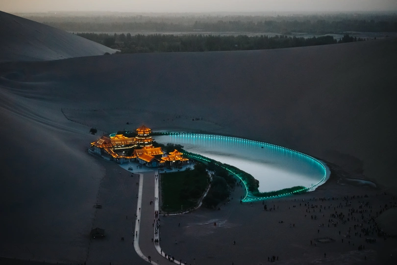 日落之后的鸣沙山月牙泉,游客还是络绎不绝,炎热褪去,夜场刚刚开始,远处的轻微风沙虽然看起来不通透,但是丝毫不影响人们的游玩。在失去了色彩之后,唯有中间的月牙泉和塔楼放射着光芒,冷暖对比。