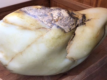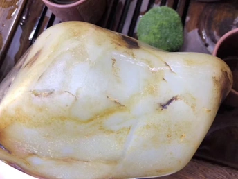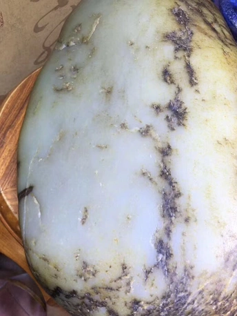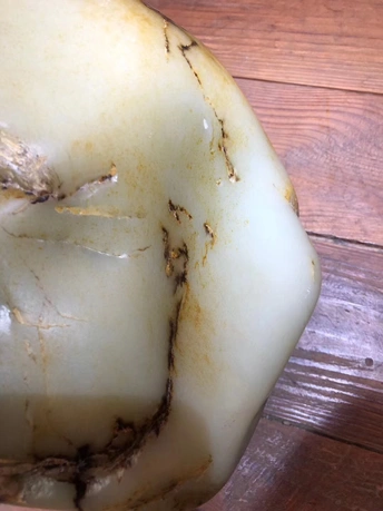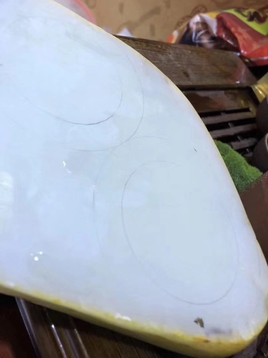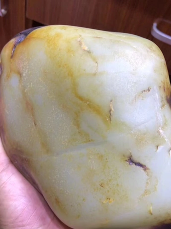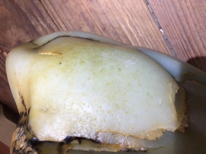 对于一块公斤级大料来说,很多人都觉得做大摆件最合适,顺裂而设计雕刻损耗较小,如果切了还要承担风险,切不好简直暴殄天物,不过对于市场来说镯子还是比较受欢迎的,为了大家的需求直接开切,不就是一点风险损耗嘛,承担不起还卖什么玉呢?东西非常直观,金皮白肉轻松羊脂,一刀下去两只镯子,有没有惊艳到你呢?